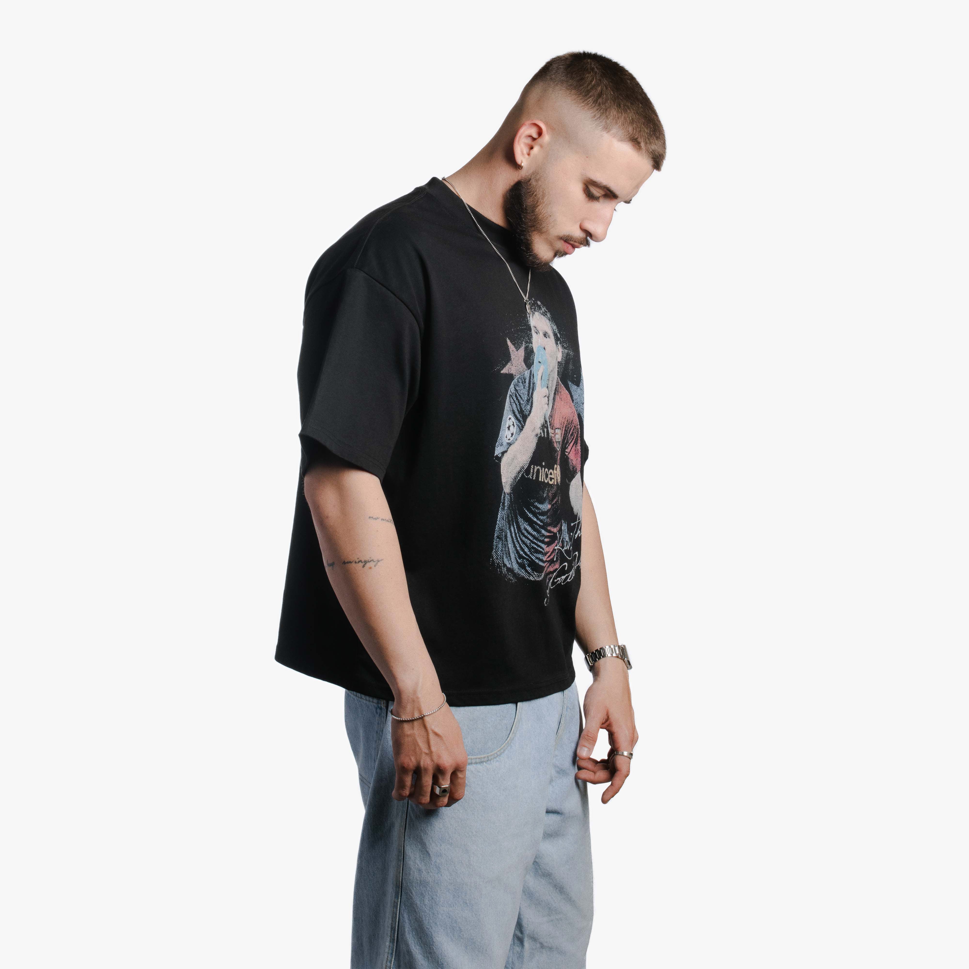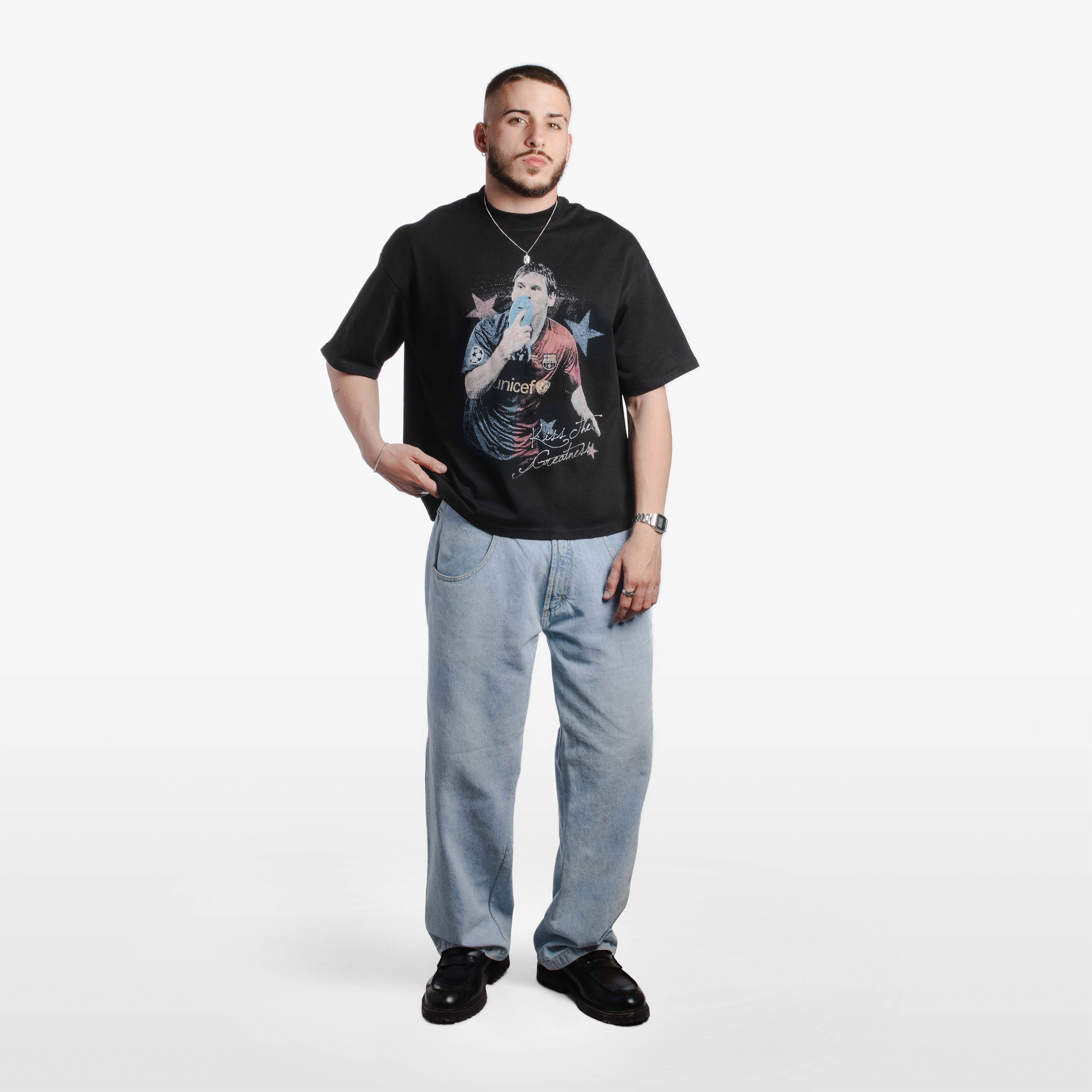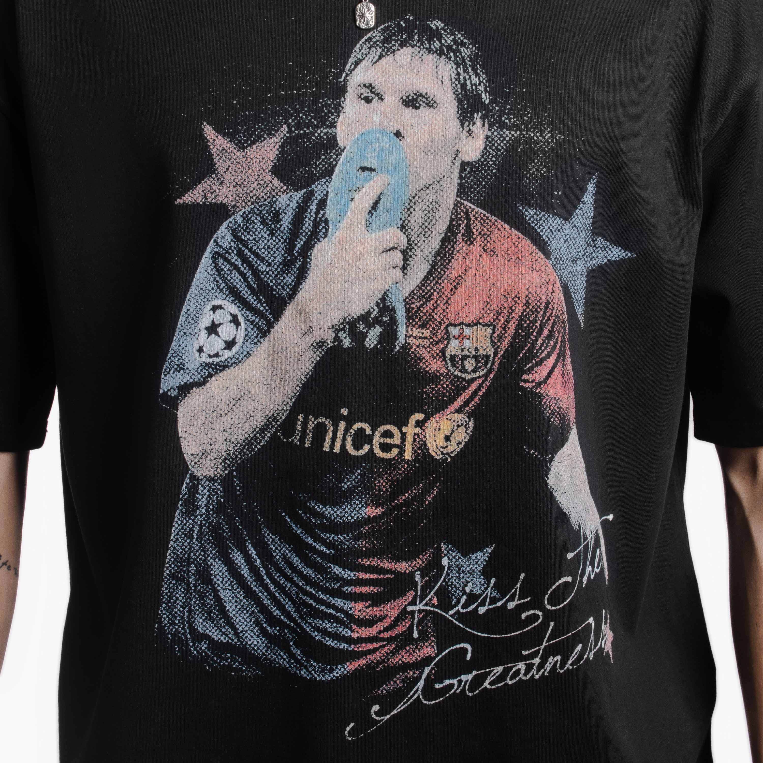 Black boxy-fit T-shirt with dropped shoulders. On the front, Lionel Messi in Rome 2009, captured in the moment he lifted his boot after the Champions League final, presented with a slightly worn finish and a subtle vintage-textured touch to the design.