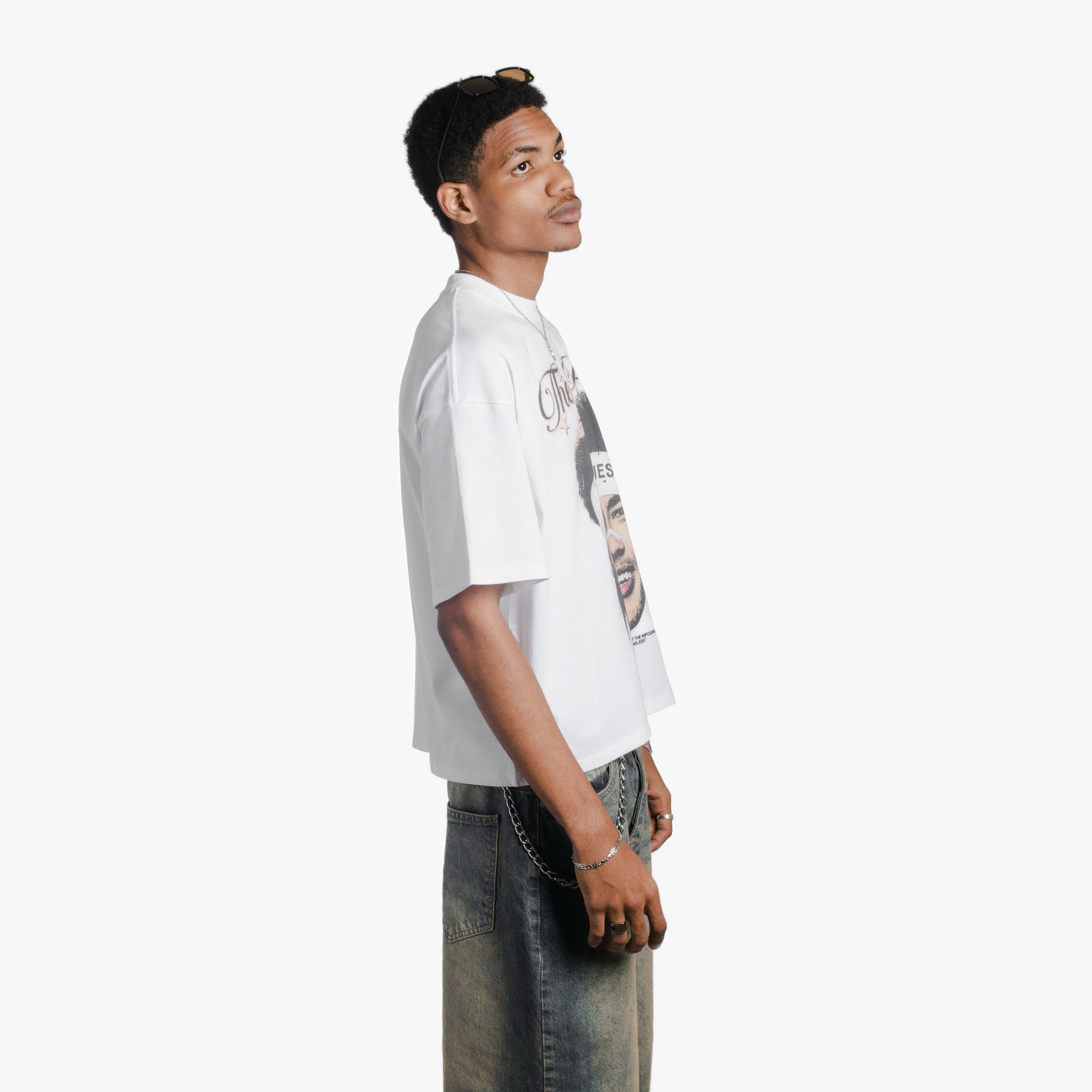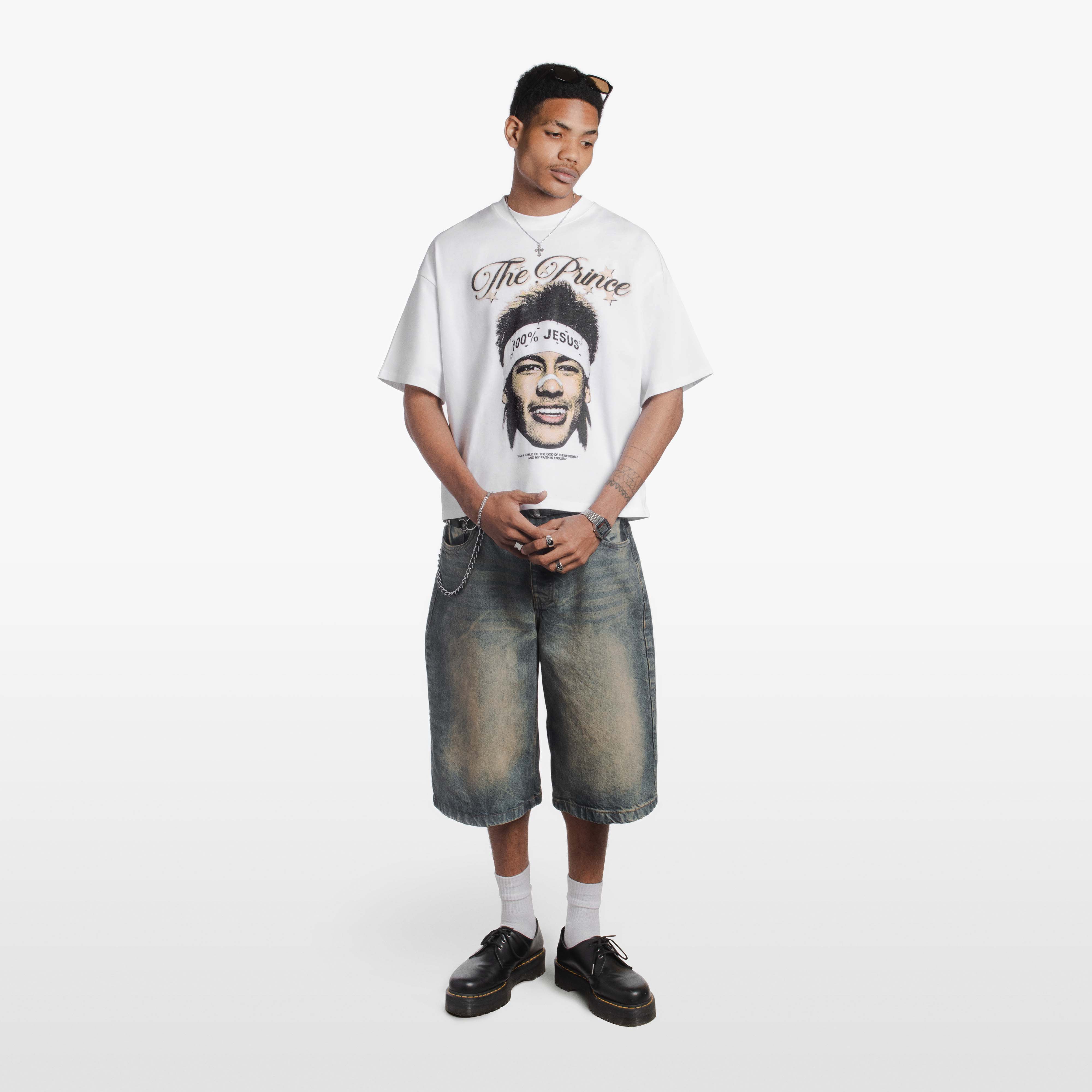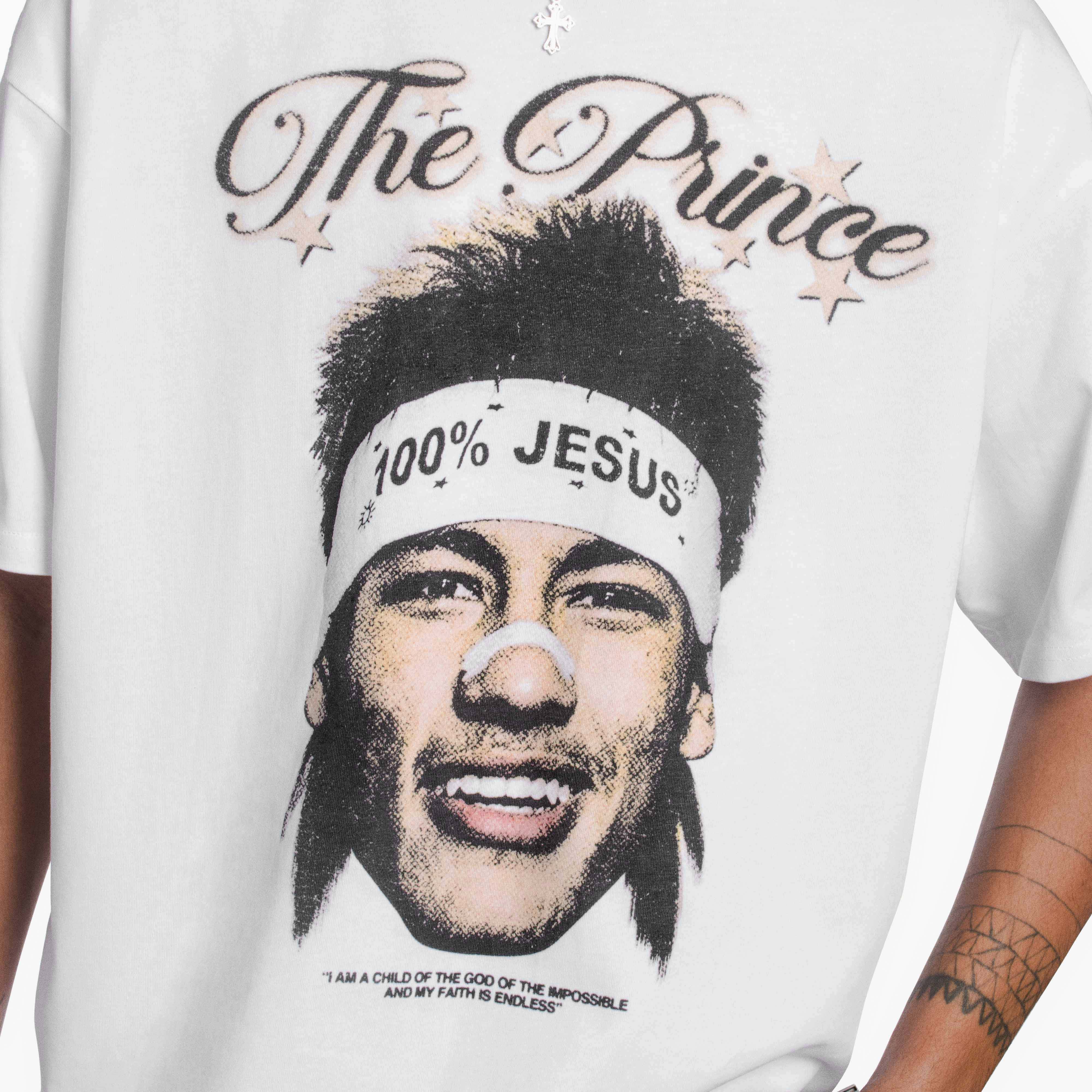 White boxy-fit T-shirt with dropped shoulders. On the front, Santos-era Neymar wearing his iconic “100% Jesus” headband, presented with a slightly worn finish and a subtle vintage-textured touch to the design.