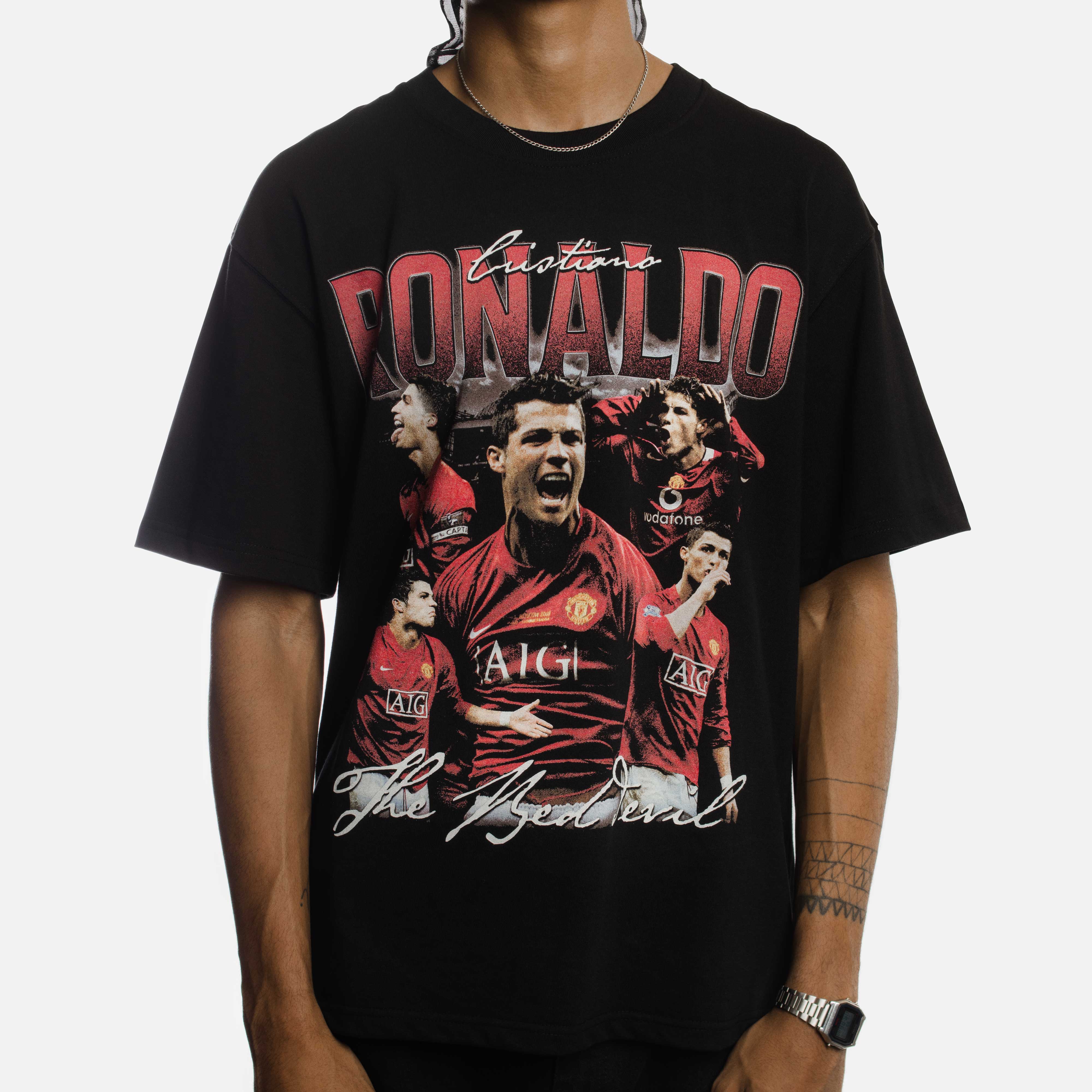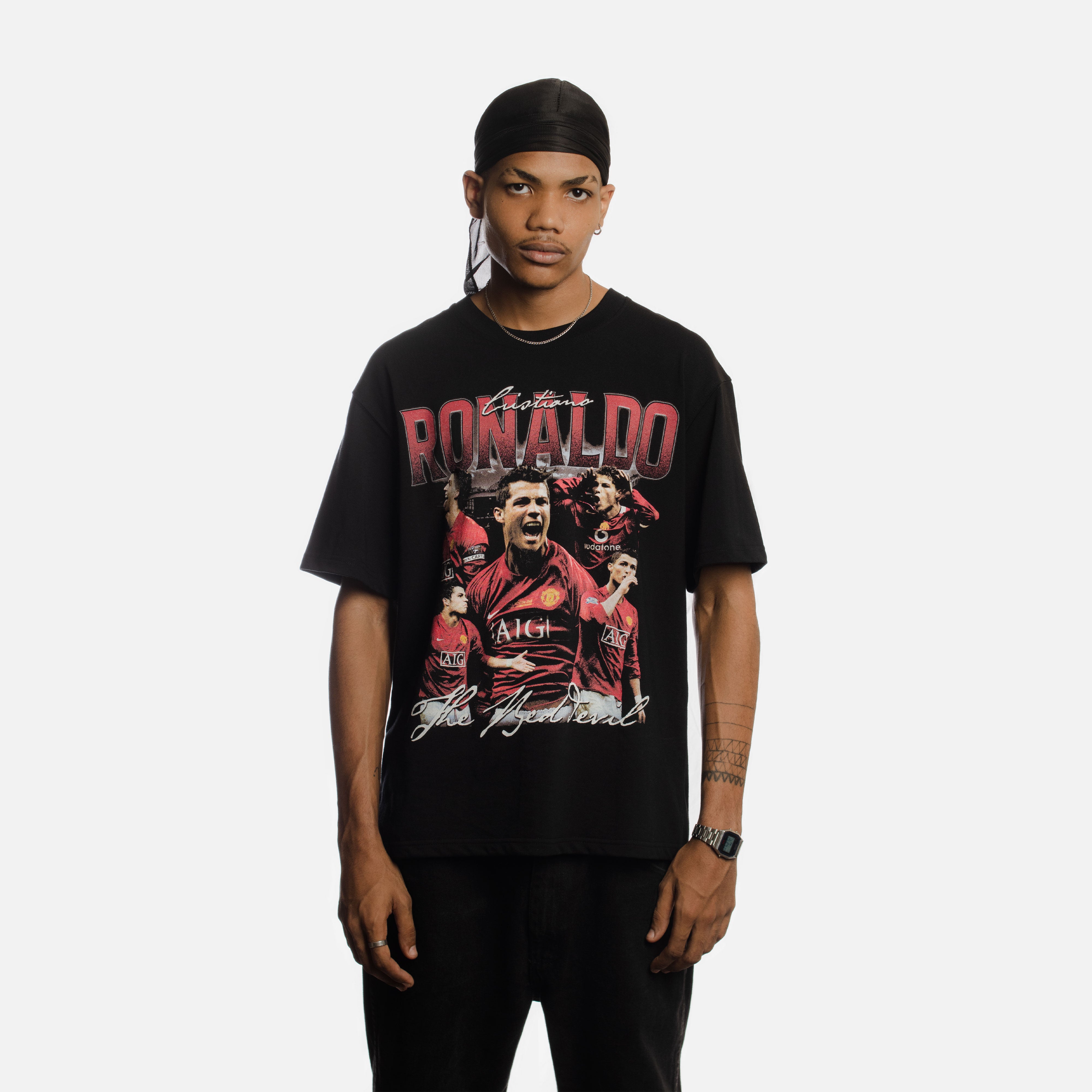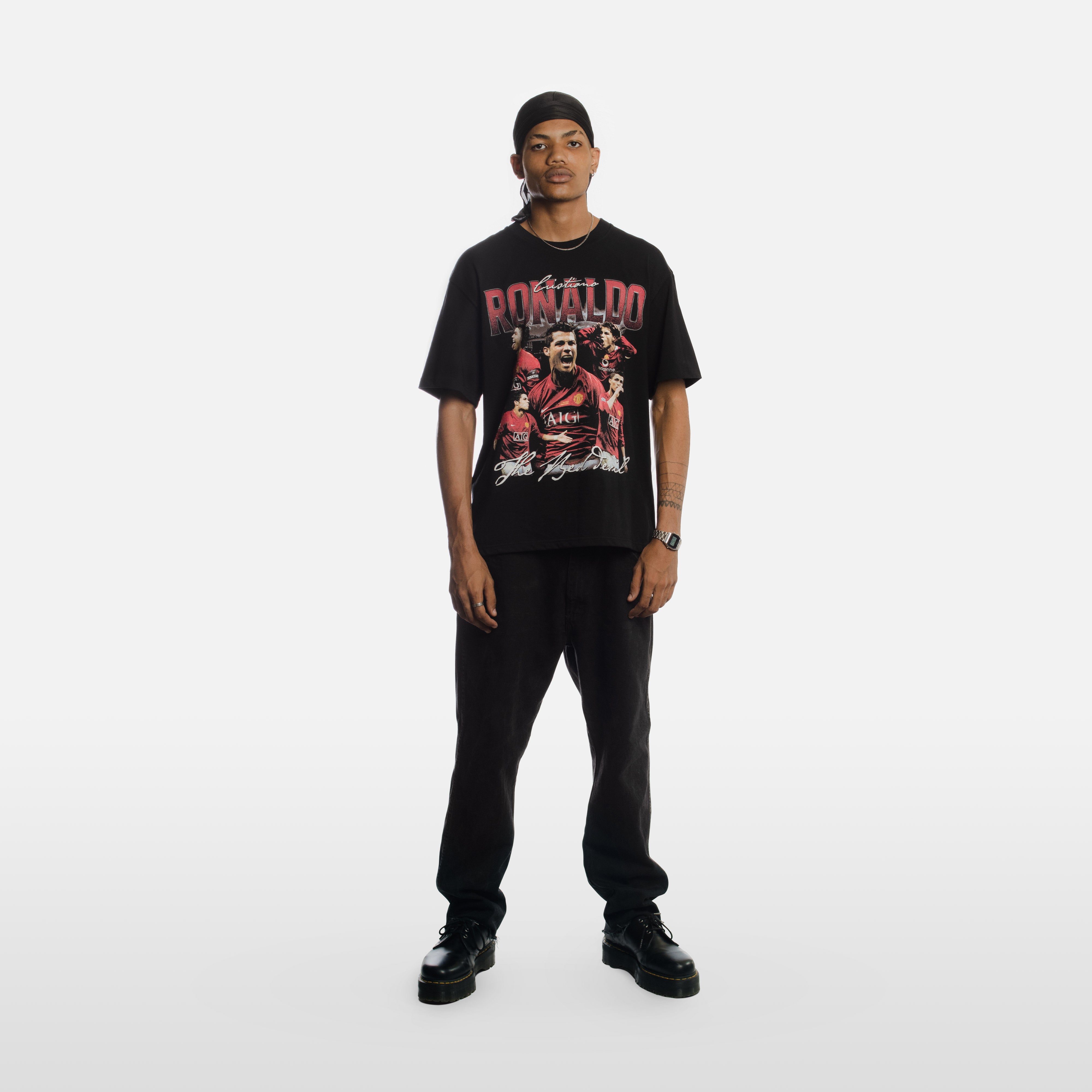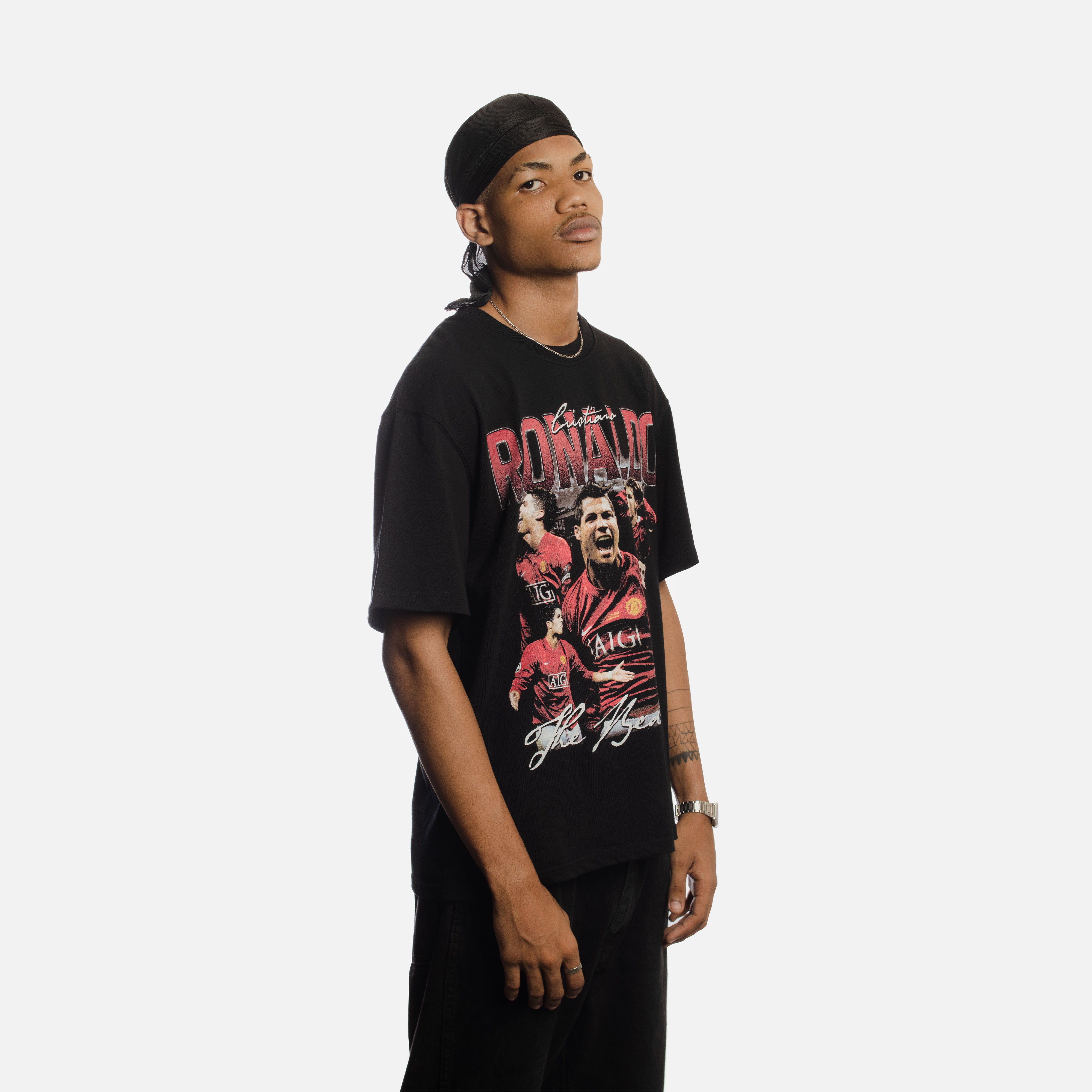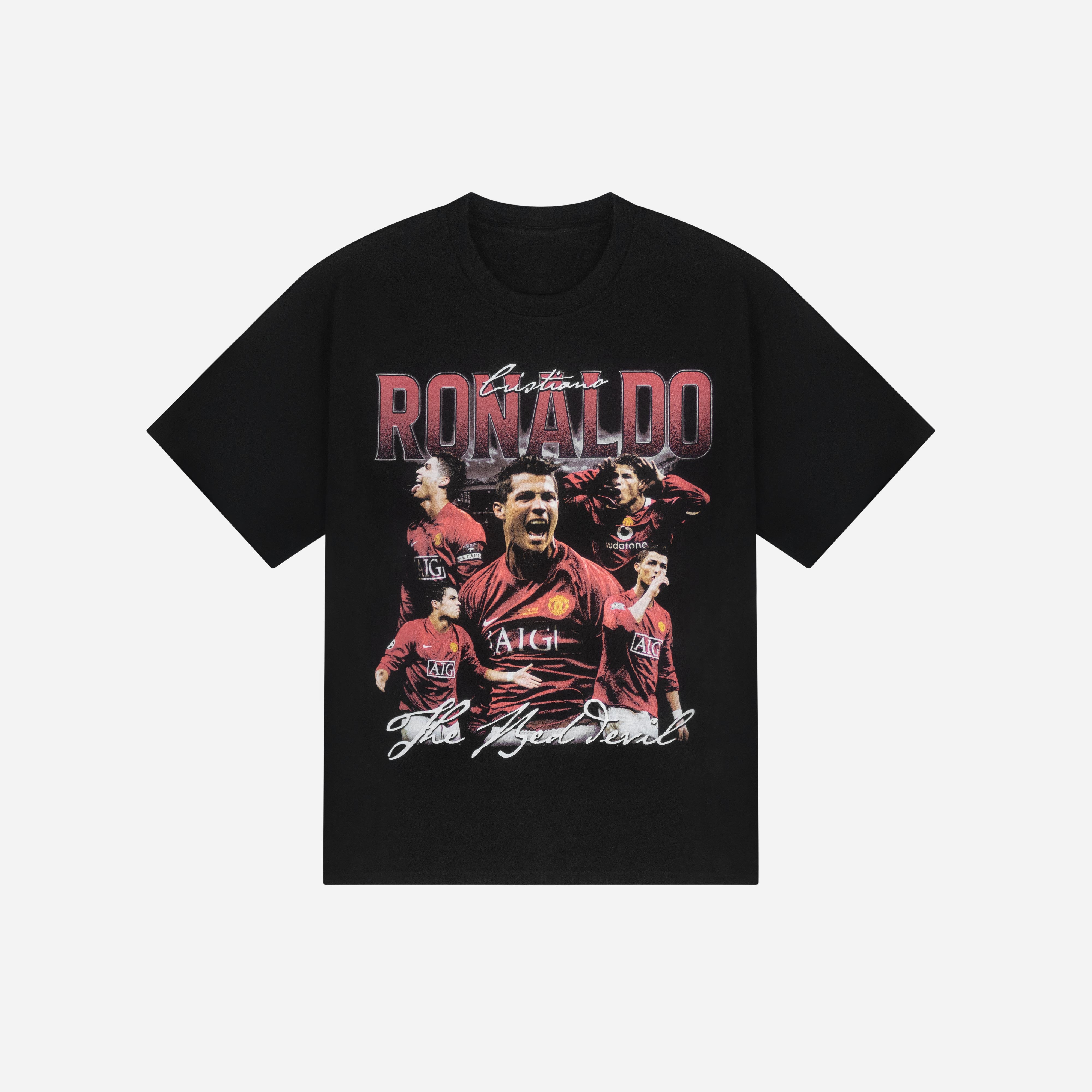 A tribute to peak performance, hunger, and the making of a legend. 2008 — Cristiano Ronaldo at Manchester United. Printed on a heavyweight black tee, 100% cotton (300 GSM), with an oversized fit — built for impact, durability, and iconic presence.